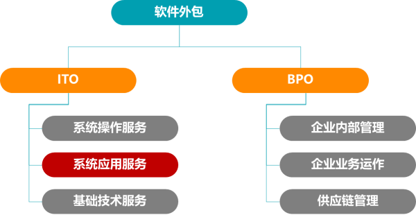 非核心的IT业务外包部分,被认为是信息技术外包(ITO);而基于IT的业务流程外包部分,称之为业务流程外包(BPO)。