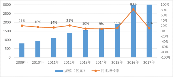 在全球信息化浪潮的强烈推动下,软件产业在全球范围内已经发展成为一个规模庞大、最具活力的产业。2009年,全球软件外包规模在800亿美元,到2017年,全球软件外包规模达到2200亿美元。全球软件外包行业经过快速增长状态后,目前增长率趋缓,增长率仍然在接近10%左右。