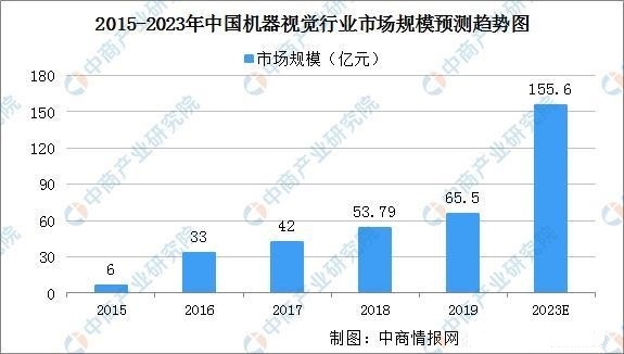 高工产研机器人研究所(GGII)数据显示,2019年中国机器视觉市场规模65.50亿元(该数据未包含计算机视觉市场规模),同比增长21.77%。2014-2019年复合增长率为28.36%。GGII预测,到2023年中国机器视觉市场规模将达到155.6亿元。