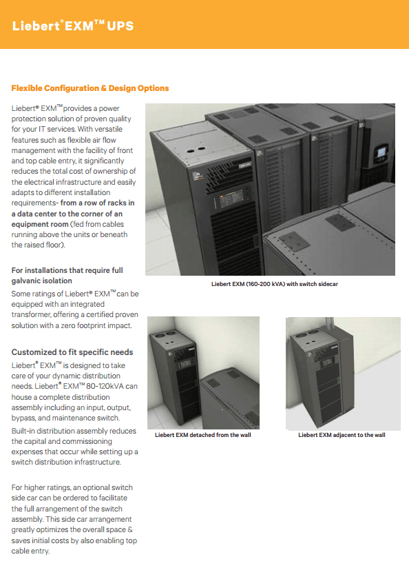 维谛Liebert.EXM 系列UPS是维谛技术推出的新一代基于IGBT整流技术的高频、塔式UPS。容量段覆盖80~200kVA,主要客户群为中小型IT企业、金融服务保险以及加工制造业。Liebert.EXM 初始投资少,后期运营成本低,可靠性高,在保证极高的MTBF和极低的MTTR同时,还兼具优异的灵活性。 最适合于: 数据中心/主机托管/托管 教育 政府 医 疗 电信 运输