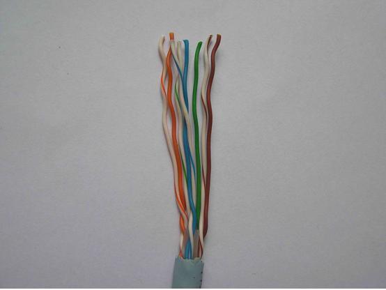 将线缆解纽,由于解纽直接影响到性能,所以应注意解纽的长度不能太长,并将解纽后的导线理直,将导线按568B(白橙、橙、白绿、蓝、白蓝、绿、白棕、棕)或568A(白绿、绿、白橙、蓝、白蓝、橙、白棕、棕)(从左向右排)的顺序理齐,不要让线弯弯曲曲的。