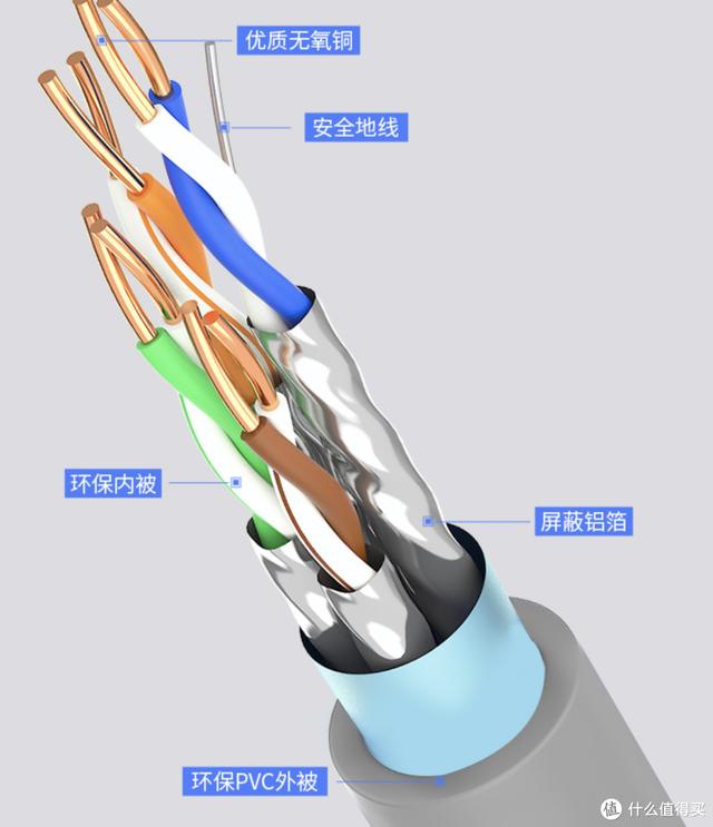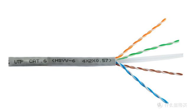 对比超五类网线,增加了十字骨架,将4对线缆分别置于十字骨架的四个凹槽内,同时电缆的直径也更粗。