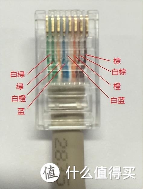 568A标准:白绿,绿,白橙,蓝,白蓝,橙,白棕,棕568B标准:白橙,橙,白绿,蓝,白蓝,绿,白棕,棕