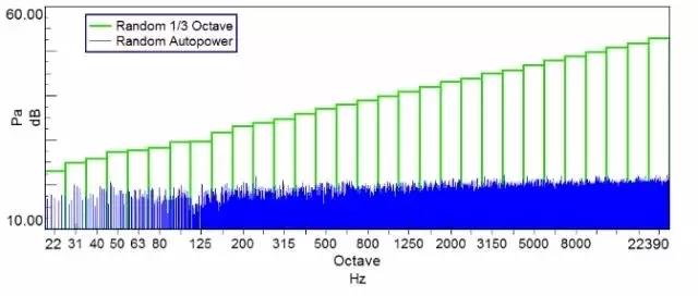 白噪声表现为窄带(蓝色)和倍频程(绿色)格式,x轴是倍频程格式。注意到,与较高频率的倍频程段相比,较低频率处的倍频带的填充数据较少。如上表格所示,这是因为较高频率的倍频带覆盖的频率范围比较低频率的倍频带宽。
