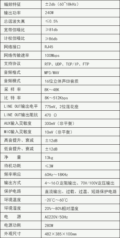 · 具有输出短路、过载保护及告警、过热告警和饱和失真告警;