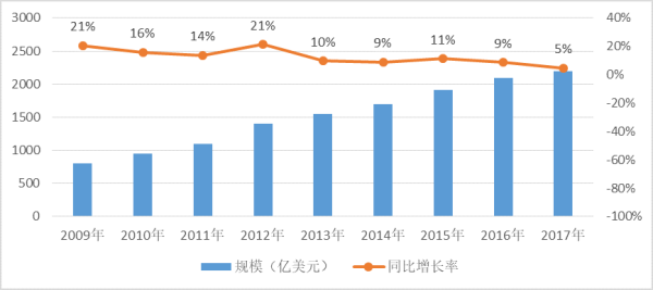 在全球信息化浪潮的强烈推动下,软件产业在全球范围内已经发展成为一个规模庞大、最具活力的产业。2009年,全球软件外包规模在800亿美元,到2017年,全球软件外包规模达到2200亿美元。全球软件外包行业经过快速增长状态后,目前增长率趋缓,增长率仍然在接近10%左右。