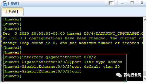 3、配置与pc2连接的0/0/2端口,将0/0/2端口分配给vlan 20。
